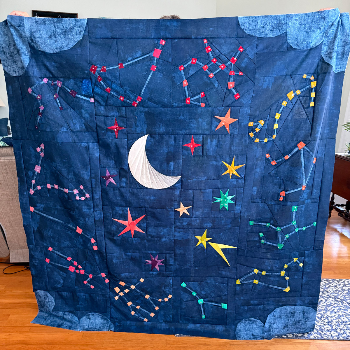 Finished Starry Signs quilt in rainbow color palette, foundation paper pieced stars and constellations, modern graphic throw quilt.