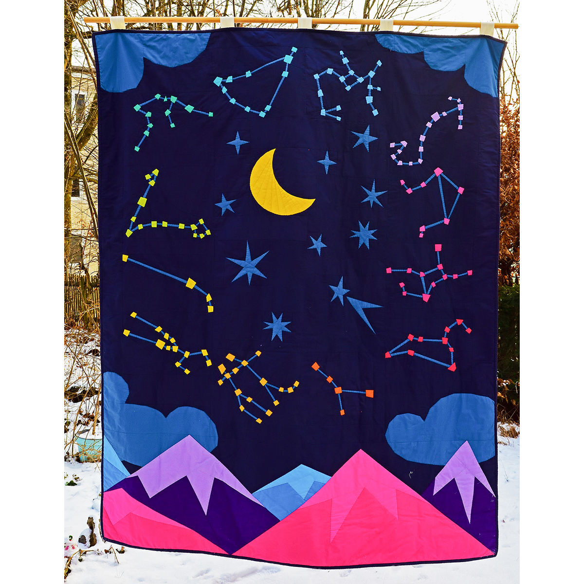 Star Constellation, Moon, and Mountain modern quilt made by Freia G. with foundation paper piecing and Starry Signs quilt pattern by Whole Circle Studio
