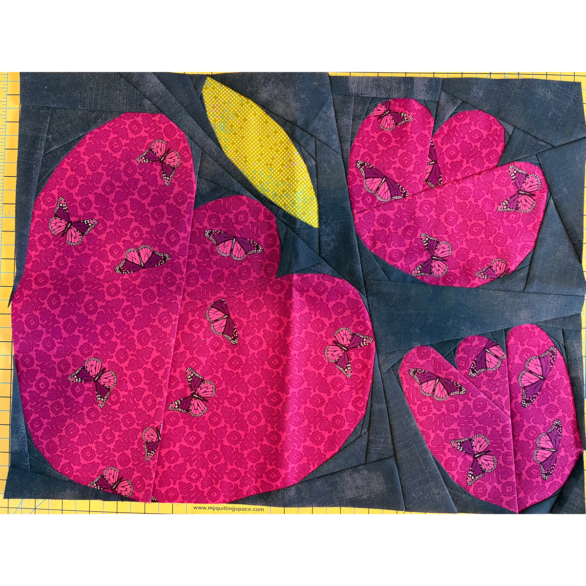 Wildflower Remix block with contrasting bold prints made by Marion R. — modern flower foundation paper pieced quilt block that highlights innovative color play.